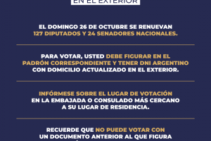 Este 26 de octubre se celebrarán las Elecciones Legislativas 2025. El padrón se puede consultar en www.padron.gov.ar Ingrese su DNI y seleccione "Argentinos en el exterior" en el apartado "Distrito" para verificar sus datos y lugar de votación.