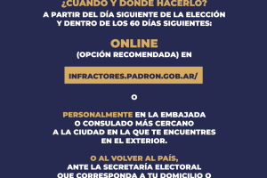 Si este domingo se encuentra fuera del país y no puede emitir su voto, dispone de 60 días hábiles para justificar su ausencia. Se recomienda hacerlo de forma online en infractores.padron.gob.ar
